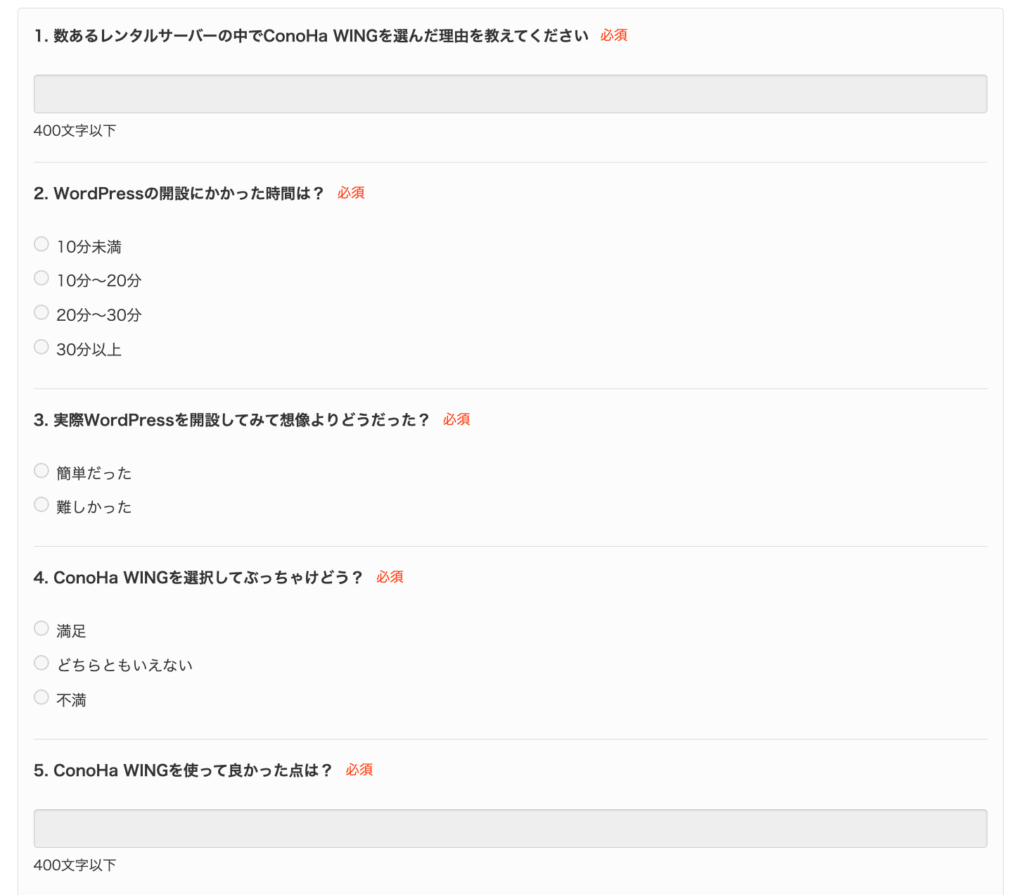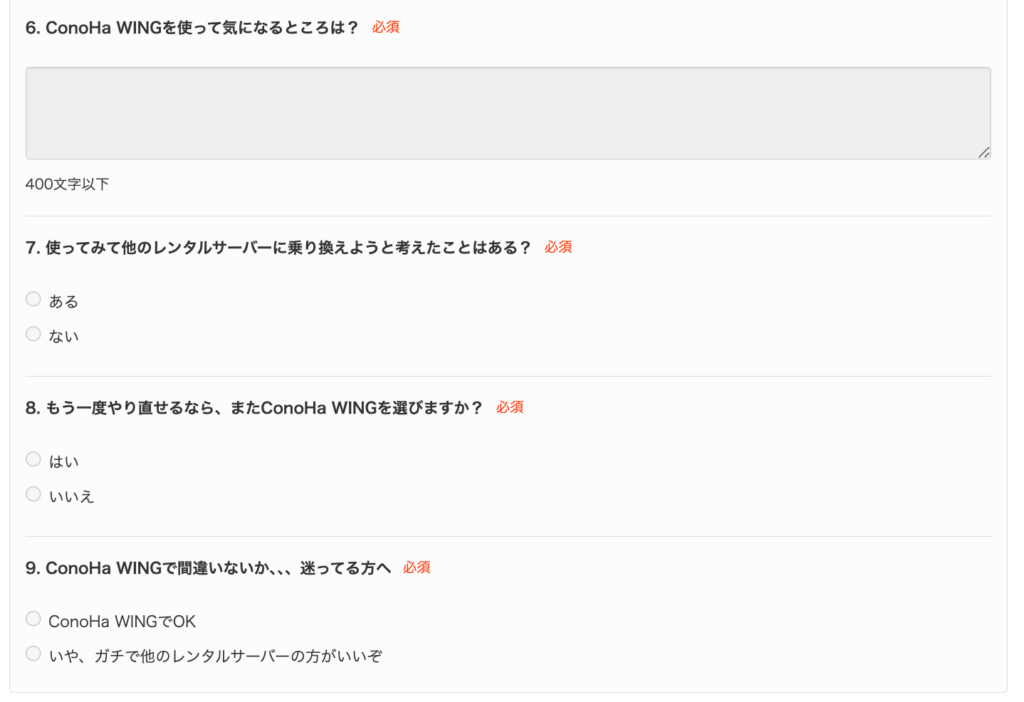 以上ですね。質問の⑦⑧⑨を見るかぎり、ConoHa WINGのユーザーは現状に満足してるんじゃないかと思います。